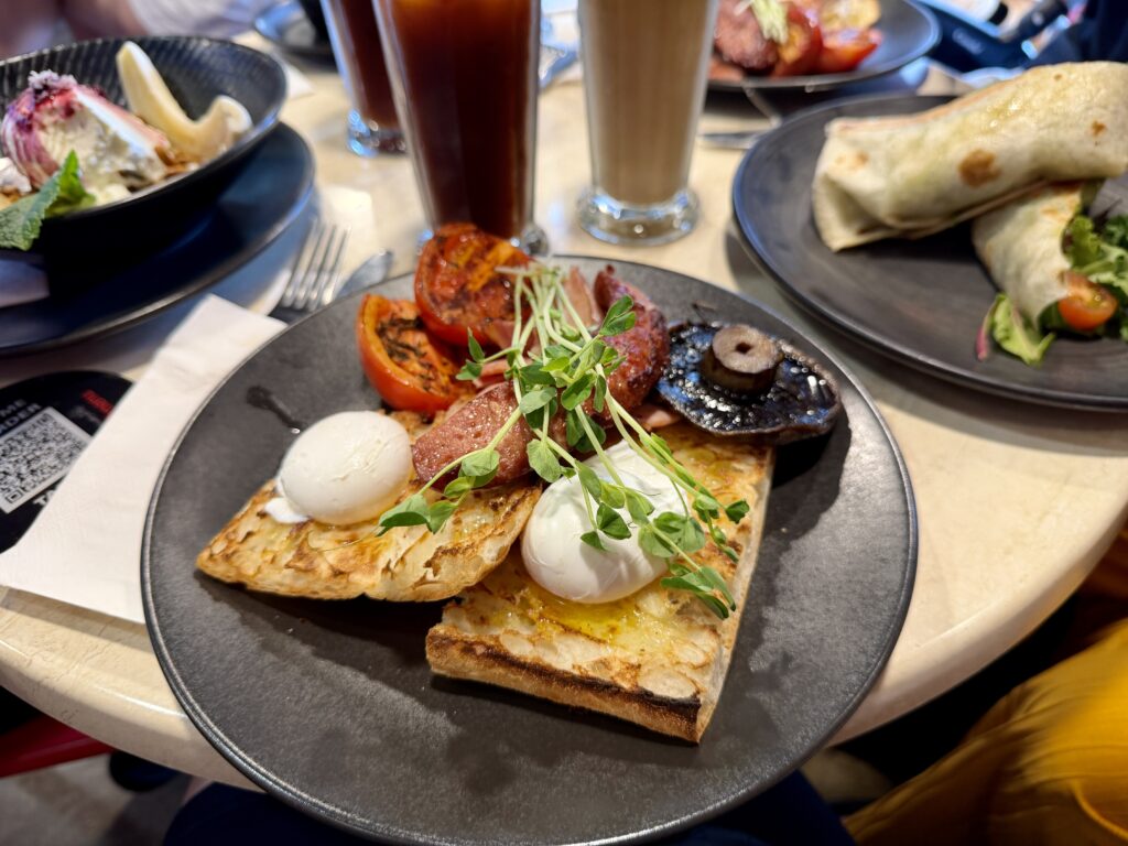 朝食は近くのカフェでいただいて…