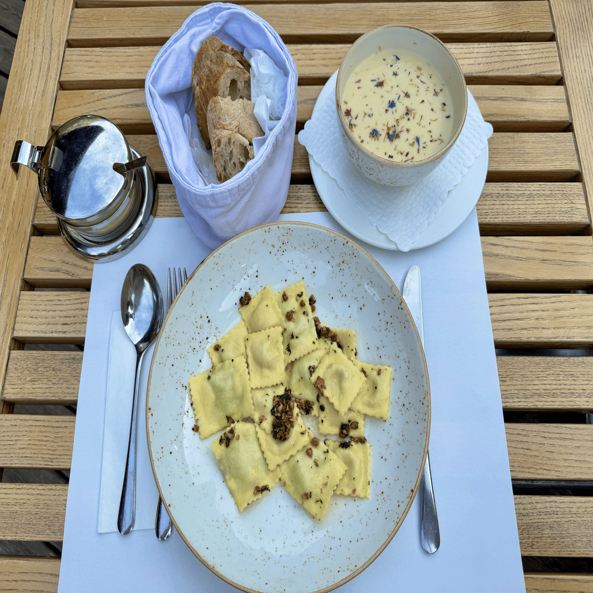 手前のメインディッシュ(ラビオリというそうですね)もガーリック効いてて美味しかったです。